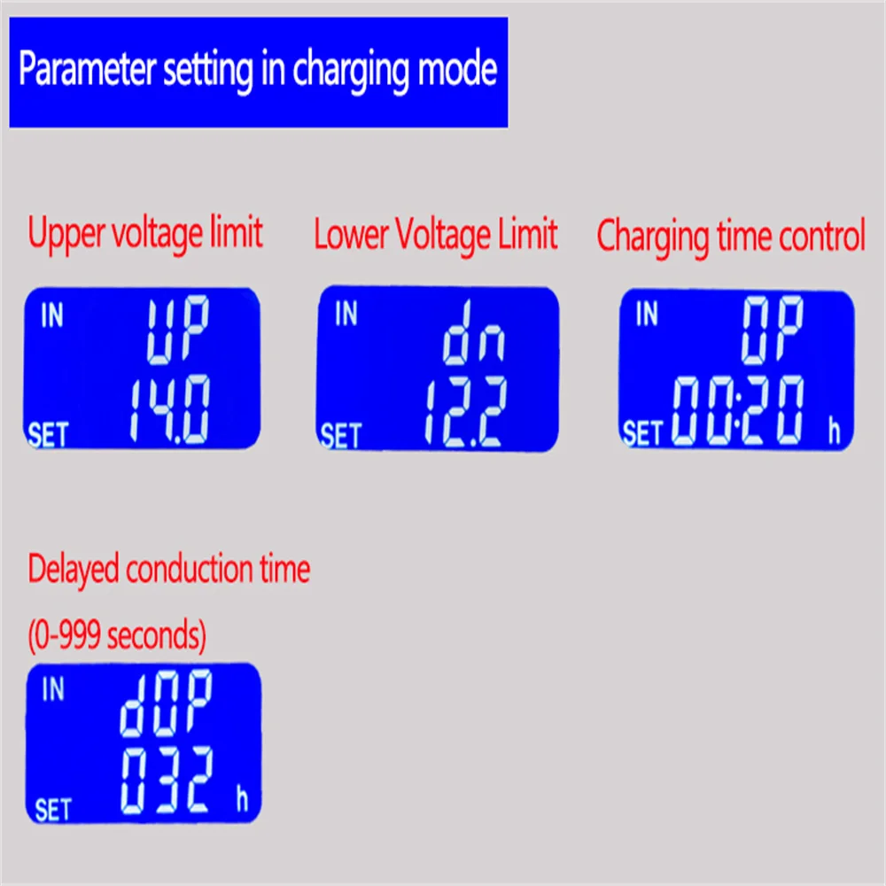 SET button: Short press to view the currently set parameters; long press the SET button to enter the parameter setting interface, set UP: voltage upper limit, dn: voltage lower limit, OP: conduction time, dOP: delayed conduction time (0-999 seconds) , FOP in discharge mode: forced on time (0-10 seconds)